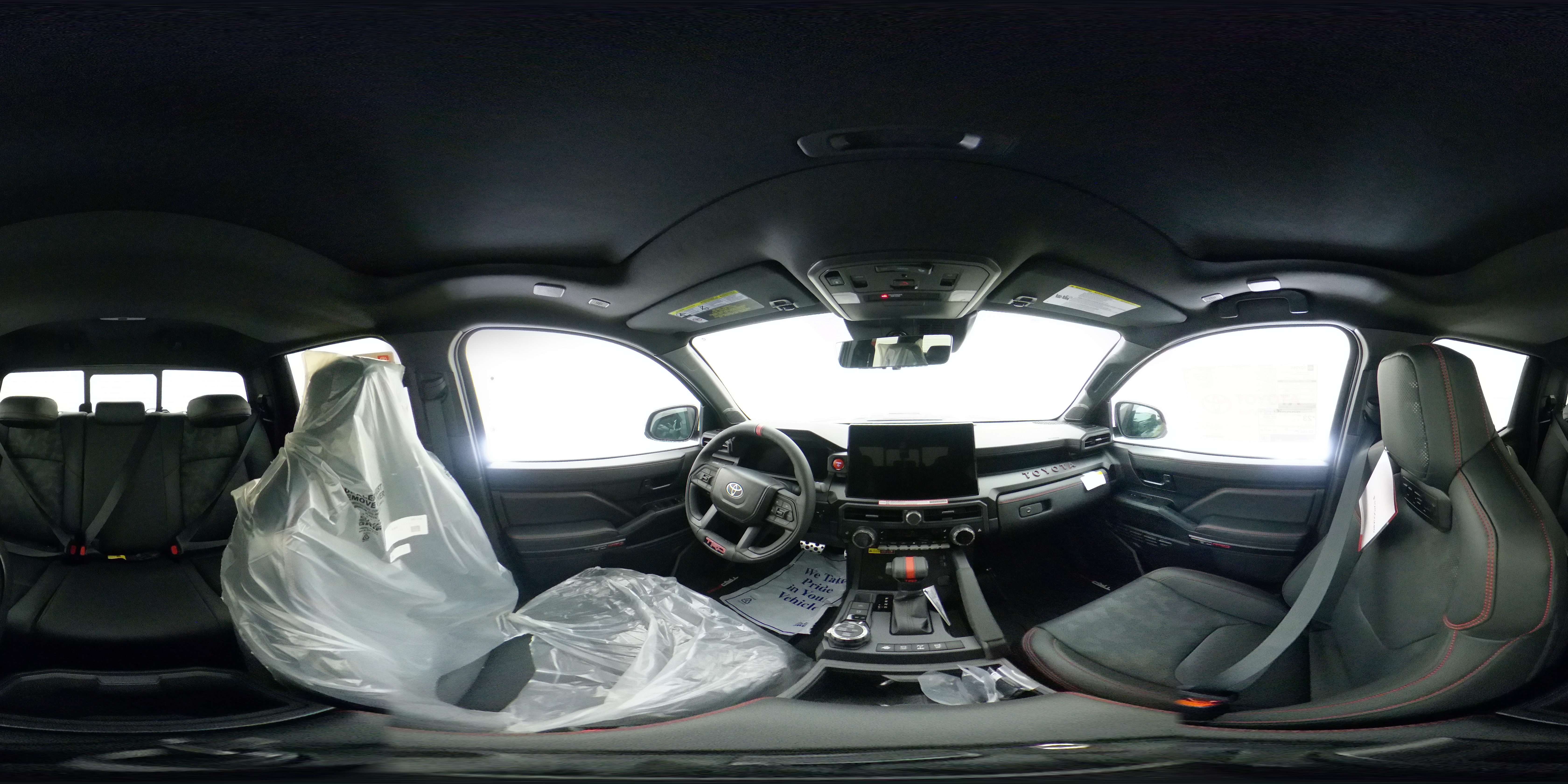 - TRD Pro leather-trimmed manual tilt/telescopic steering wheel with TRD badge, red center stripe, and phone, audio, display/infotainment, and Driver Assist controls