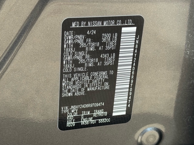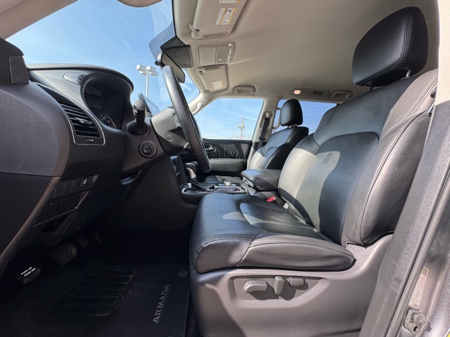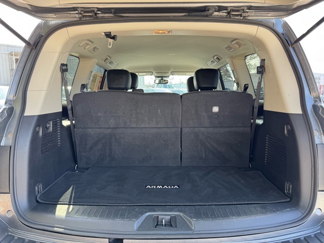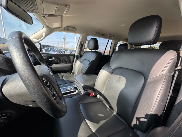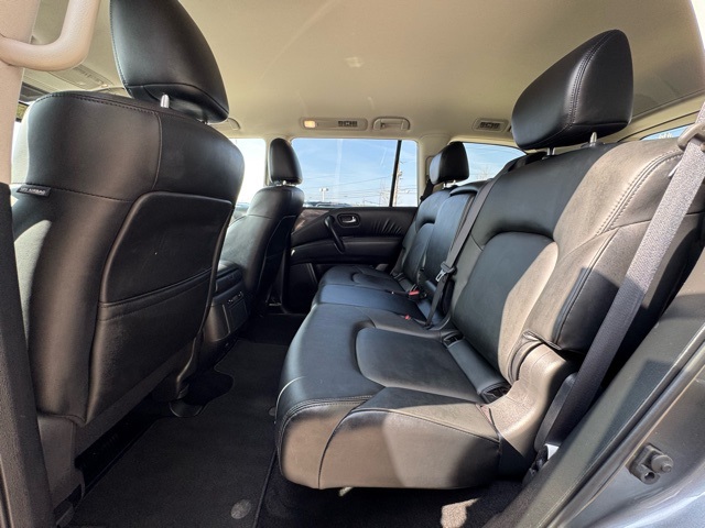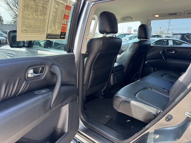 Certification Program Details: This Vehicle qualifies for Complimentary 7 year 250,000 Mile Limited Power Train Warranty. Huge Value. Vehicle age max 8yrs / under 85k miles. See Dealer for Details. 18" x 8J Alloy Wheels, 2.937 Axle Ratio, 3rd row seats: split-bench, 4-Wheel Disc Brakes, 6 Speakers, ABS brakes, Air Conditioning, Alloy wheels, AM/FM radio: SiriusXM, Anti-whiplash front head restraints, Auto High-beam Headlights, Auto tilt-away steering wheel, Auto-dimming Rear-View mirror, Auto-leveling suspension, Automatic temperature control, Brake assist, Bumpers: body-color, Delay-off headlights, Driver door bin, Driver vanity mirror, Dual front impact airbags, Dual front side impact airbags, Electronic Stability Control, Emergency communication system: NissanConnect Services, Exterior Parking Camera Rear, Four wheel independent suspension, Front anti-roll bar, Front Bucket Seats, Front Center Armrest, Front dual zone A/C, Front fog lights, Front reading lights, Fully automatic headlights, Garage door transmitter: HomeLink, Heated door mirrors, Heated Front Bucket Seats, Heated front seats, Illuminated entry, Knee airbag, Leather Shift Knob, Leather steering wheel, Leatherette Seat Trim, Low tire pressure warning, Navigation System, Occupant sensing airbag, Outside temperature display, Overhead airbag, Overhead console, Panic alarm, Passenger door bin, Passenger vanity mirror, Power door mirrors, Power driver seat, Power passenger seat, Power steering, Power windows, Radio: NissanConnect w/SiriusXM, Rear air conditioning, Rear anti-roll bar, Rear reading lights, Rear seat center armrest, Rear window defroster, Rear window wiper, Reclining 3rd row seat, Remote keyless entry, Security system, Speed control, Speed-sensing steering, Speed-Sensitive Wipers, Split folding rear seat, Spoiler, Steering wheel mounted audio controls, Tachometer, Telescoping steering wheel, Tilt steering wheel, Traction control, Trip computer, Turn signal indicator mirrors, Variably intermittent wipers, and Voltmeter.
